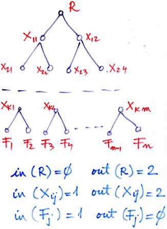| Reprezentarea folosind functiile in() si out(0 arata ca un arbore are: - un nod radacina R pentru care in(R)=0 si out(R)>0 - noduri intermediare xi pentru care in(xi)=1 si out(xi)>0 - noduri frunza Fi pentru care in (Fi)=1 si out(Fi)=0. |