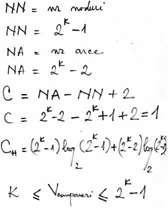 | daca se porneste de la proprietatile arborelui binar complet, atunci pe nivelul 1 se afla 21-1 noduri, la nivelul 2 se afla 22-1 noduri, la nivelul h se afla 2h-1 noduri, iar la nivelul ultim, k, se afla 2k-1 noduri. Prin insumarea termenilor progreiei geometrice: S= 21-1 + 22-1 + 23-1 + ... + 2k-1 = 2k noduri, cate are in total un arbore complet binar cu k niveluri. |