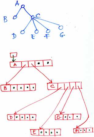 | Arborele binar se reprezinta folosind la definirea elementului, numarul maxim de pointeri ce corespund nodului cu cei mai multi descendenti. Areborele oarecare are bodul C cu 4 descendenti. Inseamna ca elemenul pentru descrierea nodurilor va avea 5 camuri, unul pentru informatia utila si 4 pentru pointeri. Se observa ca multe dintre campurile pointerilor sunt initializate cu NULL. |