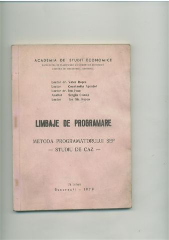 | | Valer ROSCA,Constantin APOSTOL, Ion IVAN, Sergiu COMAN, Ion Gh. ROSCA - LIMBAJE DE PROGRAMARE, metoda programatorului sef, Editura ASE, Bucuresti, 1979, 114 pg