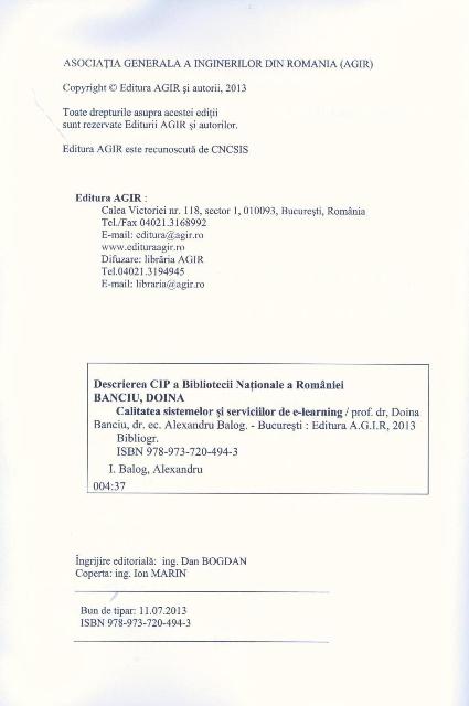Doina BANCIU, Alexabdru BALOG - Calitatea sistemelor si serviciilor de e-learning, Editura AGIR,