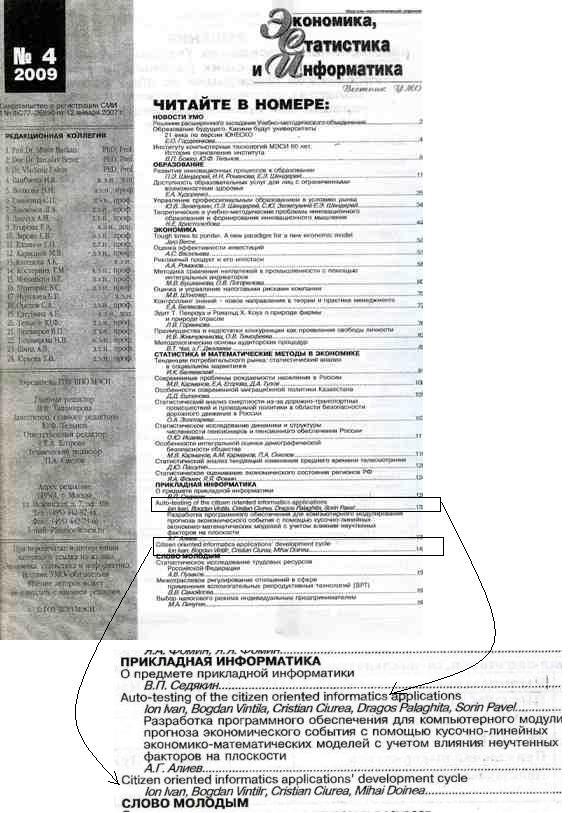 Ion IVAN, Bogdan VINTILA, Cristian CIUREA, Mihai DOINEA - Citizen Oriented Informatics Applications development Cycle , Ekonomika, Statistika, Informatica, MESI, no.4, 2009, pg.139 - 145, ISSN 1994-7844 RUSSIA