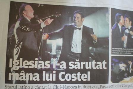 | | Luni 14 iulie 2008 la Cluj-Napoca , Costel a cantat in compania lui Julio Iglesias. Este un semn al pretuirii unui mare artist care a recunoscut in acest tanar, un talent valoros. candva, sub cupola Atheneului, geo Bogza a sarutat mana lui Arghezi. Era gestul recunoasterii fie a unei erori facute candva, fie recunoasterea valorii marelui Arghezi. Acum, peste ani, in public, iata un strain, marele Iglesias, face acelasi gest nobil. cati dintre noi avem puterea de a recunoaste un talent, o somitate si cati au capacitatea de a afisa admiratia fata de cel care este in fata noastra? |