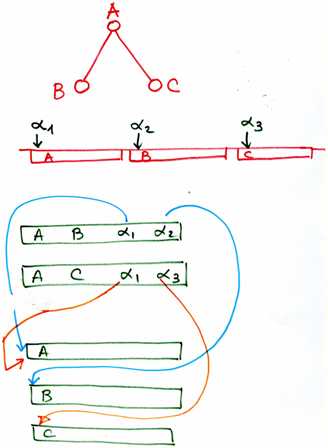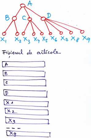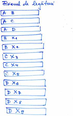 | daca trebuie regasite rapid informatiile, fisierul de legaturi va contine in structura articolelor: - numele nodului parinte - adresa nodului parinte - numele nodului descendent - adresa nodului descendent. Aceste informatii se obtin cu usurinta prin faptul ca fisierul de repere (aqrticole) este un fisier cu inregistrari de lungime fixa. Se scriu programe care traverseaza acest fisier, memoreaza adresele articolelor si codurile reperelor si subanmsamblelor, informatii pe care le utilizeaza mai apoi la completarea fisierului de legaturi. Operatia se executa o singura data. |