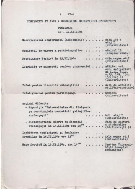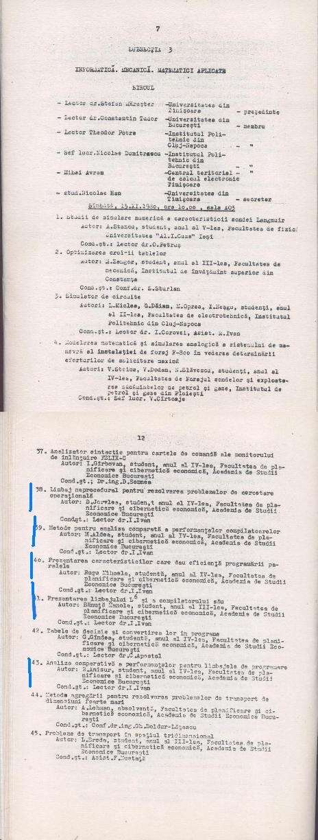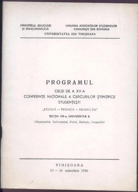 Intre 15 si 16 noiembrie 1980 a avut loc la Universitatea din Timisoara Cea de a XV-a Conferinta nationala a cercurilor Stiintifice Studentesti STIINTA-TEHNICA-PRODUCTIE, iar la sectiunea a VIII-a matematica, Informatica, Fizica, Biologie , Geografie, la subsectia 3 de informatica, mecanica, matematici aplicate au fost prezentate lucrari ale