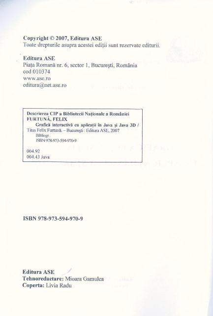 Felix FURTUNA - Grafica interactiva cu aplicati in JAVA si JAVA 3D, Editura ASE, Bucuresti, 2007, 171pg ISBN 978-973-594-970-9