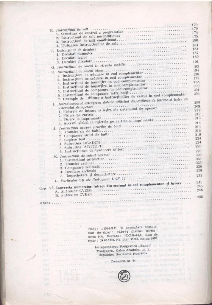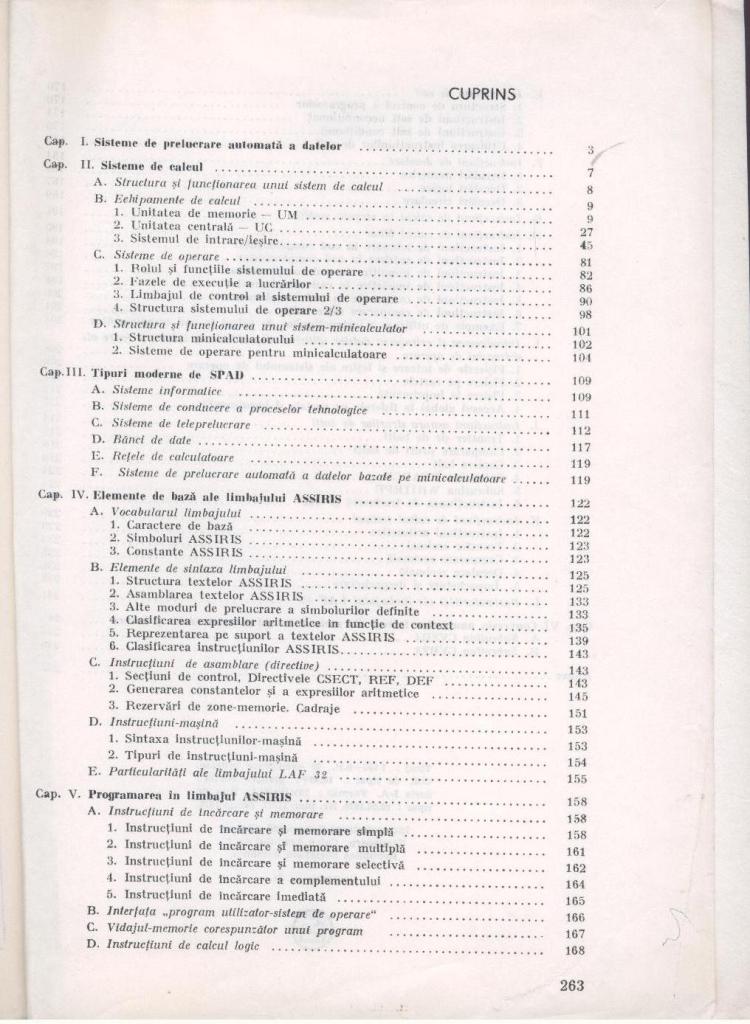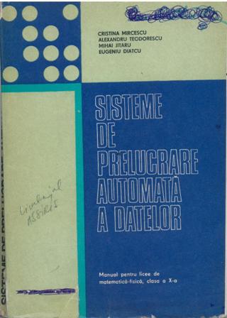 | Manualul elaborat de Cristina MIRCESCU (CAP ii a, b, c), Alexandru TEODORESCU (cap IV - VI), Mihai JITARU (cap IV - VI), Eugeniu DIATCU (cap I, II D si III), era destinat elevilor din clasa a X-a si desi era cu titulatura de prelucrare a datelor, ceea ce ducea spre fisiere si baze de date, se ocupa de fapt de limbajul de asamblare ASSIRIS. Tot prelucrare de date facand sui acesta dar si limbajele COBOL si FORTRAN intrau sub aceeasi umbrela. Manualul avea in cele 264 de pagini, capitole ce abordau: - sistemele de calcul - tipuri moderne de SPAD - elemente de baza ale limbajului ASSIRIS - programarea in limbajul ASSIRIS. Erau prezentate instructiunile de salt, de decalare, de calcul in virgula mobila, lucru cu siruri de baiti, de calcul zecimal, de lucru cu fisiere. Anexa 4 cuprindea INSTRUCTIUNI MASINA ALE LIMBAJULUI ASSIRIS. tIRAJUL A FOST DE 1630 EXEMPLARE LA CARE S-AU ADAUGAT 65 EXEMPLARE BROSATE. a APARUT IN 1978 LA eDITURA DIDACTICA SI PEDAGOGICA. |