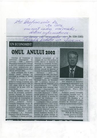 | Profesorul doctor docent Constantin IONESCU, este unul dintre cei care au sesizat incotro bate vantul si a reusit sa se adapteze noilor conditii, trecand de la statistica spre analiza si proiectarea de sisteme informationale si informatice. A condus multe doctorate in informatica. Sunt multi profesori de azi care ii datoreaza formarea ca dascali, ca oameni si cercetatori. Cartea pe care a coordonat-o de Proiectarea Sistemelor Informatice, celebra disciplina PSI este si acum, dupa multi ani un model de cum se realizeaza o lucrare stiintifica in grup, sub o indrumare atenta si competenta. Desi a avut functii foarte importante in stat, profesorul Constantin IONESCU a ramas uman, bun si foarte apropiat de tineri. | |