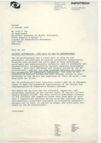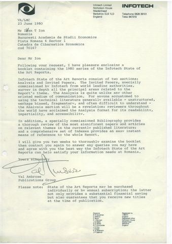 La biblioteca ICI erau volume de testare software cu contributii de la INFOTECH. Le-am cerut alte materiale caci erau la etajul 7 la biblioteca doamnei Mihnea CURRENT PAPERS IN COMPUTERS si puteam vedea acolo toate noutatile. Au trimis si m-am folosit de acele materiale.