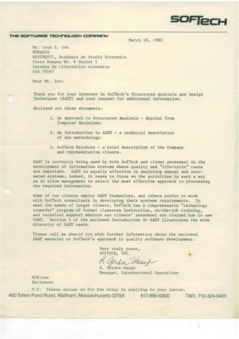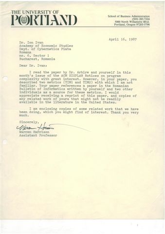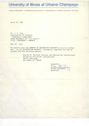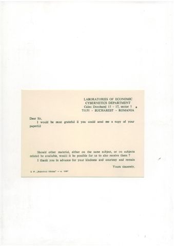 De la profesorul Fabian am invatat sa trimit si sa si astept raspuns.Toti raspundeau. Era important ca plicul sa ajunga in ASE si acolo sa-mi fie dat mie.Uneori am regasit materiale care erau solicitate de mine, undeva pe la niste laboratoare, ratacite.
