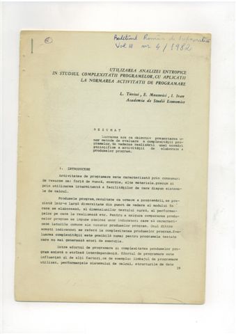 Ludovic TOVISSI, Ion IVAN, Emil MOSCOVICI - Utilizarea analizei entropice in studiul complexitatii programelor, cu aplicatii la normarea activitatii de programare, Buletinul Roman de Informatica, vol. 3, nr. 4, 1982, pg 39-44