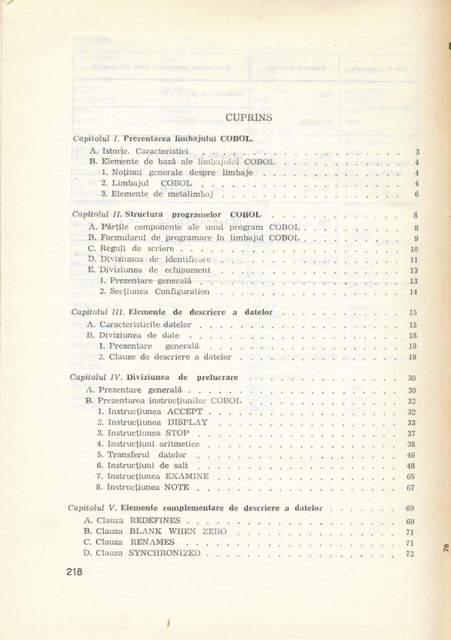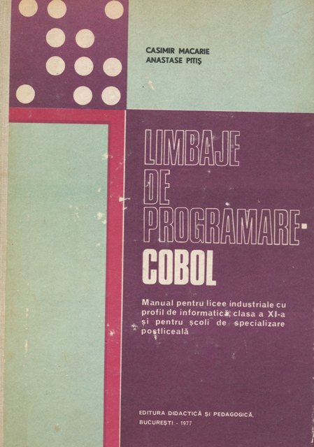 Cazimir MACARIE, Anastase PITIS - Limbaje de programare - COBOL, manual pentru licee cu profil de informatica, clasa a XI-a si pentru scoli de specializare postliceala, Editura Didactica si pedagogica, Bucuresti, 1977, 220pg.