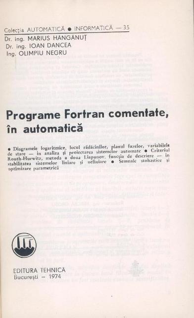 M. HANGANUT, I. DANCEA, O. NEGRU - Programe FORTRAN in automatica, Editura Tehnica, Bucuresti 1974, 305 pg
