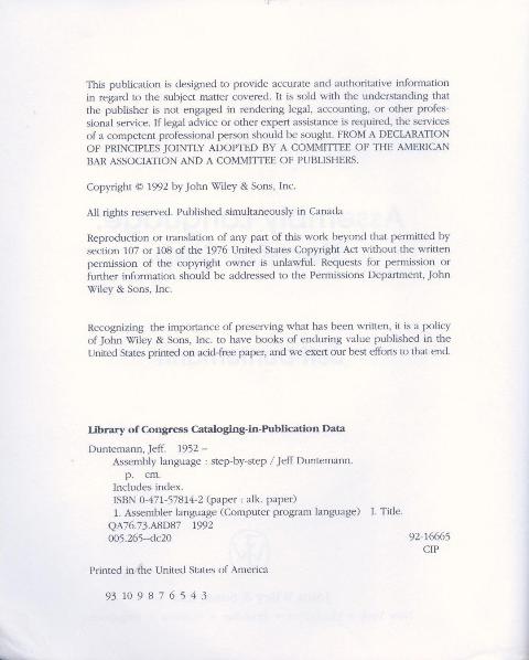 Jeff DUNTEMANN - Assembly Language: step by step, John Wiley&Sons Inc., New York, 1992, 432pg, ISBN: 0-471-57814-2