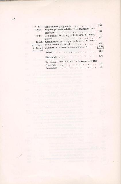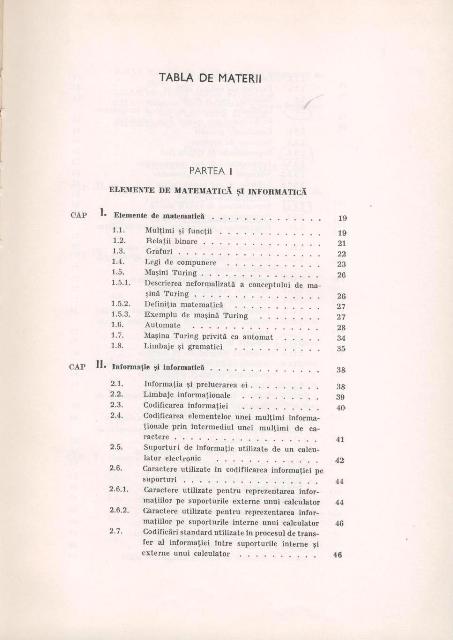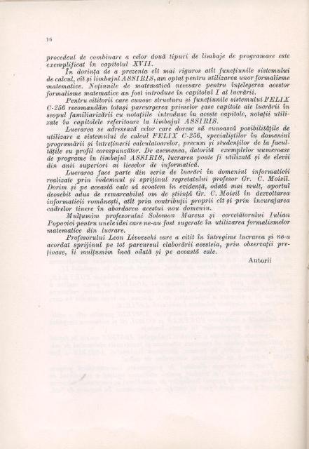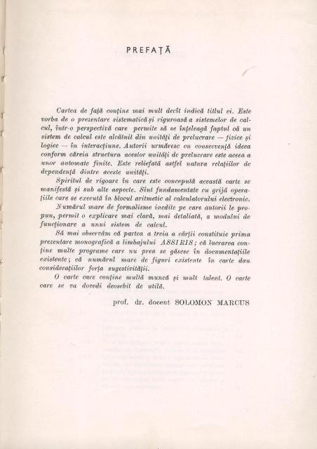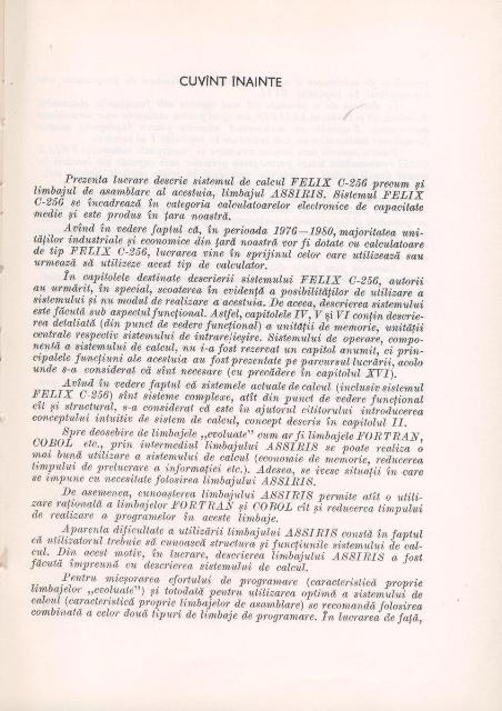 Al. TEODORESCU, I. CATONA, C. POPESCU - Sistemul Felix C-256. Limbajul ASSIRIS, Editura Tehnica, Bucuresti, 1974, 447pgBeneficiind de prefata semnata de prof.dr.docent Solomon MARCUS, cei trei autori, specialisti recunoscuti in domeniul sistemelor de calcul realizate in tara noastra sub denumirea Felix C-256, dupa o licenta din Franta, acolo unde au si avut specializari, au structurat lucrarea in trei parti. In prima parte sunt abordate aspecte teoretice legate de informatie, masina Turing, gramatici formale, limbaje, alfabete, reprezentari ale informatiei, algebra booleana, un limbaj de asamblare AFICT.Formatia de matematicieni a primilor doi autori, alaturi de formatia de automatist a lui C. POPESCU au dat rigoare si profunzime abordarii. Partea a doua este destinata prezentarii sistemului de calcul Felix C256 pornind de la descrierea unitatilor de memorie, de calcul, a sistemului de intrare/iesire, aducand elemente de detaliu privind descrierile la nivel fizic dar si la nivel logic pentru toate acestea. Ultima parte este destinata prezentarii limbajului ASSIRIS. Autorii descriu mai intai vocabularul, setul de caractere,modalitati de structurare a programelor, registri si definiri si modalitati de initializare a variabilelor. Sunt luate rand pe rand tipurile de instructiuni care executa operatii elementare de incarcare, memorare, de calcul, instructiunile de control, precum cele de salt conditionat si de salt neconditionat, instructiunile de lucru la nivel de bit, instructiuni de lucru cu siruri de caractere. De la pagina 341, pana la pagina 389, deci un spatiu important al lucrarii este destinat operatiilor de intrare-iesire. Tehnicilor de sectionare si segmentare, care au menirea de a creste sui productivitatea programatorilor dar si viteza de prelucrare a programelor de mari dimensiuni, le-a fost dedicat capitolul al XVII-lea, intitulat chiar sas, Sectionare si segmentare. Lucrarea este riguroasa, coerenta, omogenta si la vremea ei a fost un instrument de lucru pentru toti programatorii. Si acum este un exemplu de cum trebuie scrisa o carte adevarata de informatica pentru practicienii dezvoltatori de aplicatii ceosebit de complexe. |