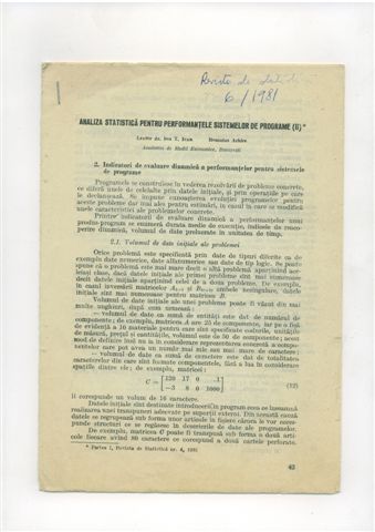 | > | | Ion Ivan, Romulus Arhire, Analiză statistică pentru performanţele sistemelor de progame (I), Revista Română de Statistică, nr. 4, 1981, pg. 21-28.