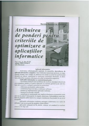 | > | Ion IVAN, Adrian PIRVULESCU - Atribuirea de ponderi pentru criteriile de optimizare a aplicatiilor informatice, Revista Romana de Statistica, nr. 2, 2005, pg. 21 - 312005