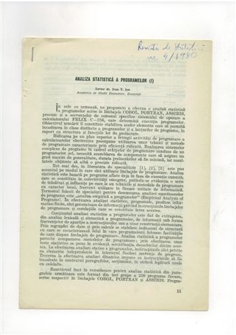 | | Ion IVAN – Analiza statistica a programelor - 1, Revista de statistica, nr.4, 1980, pg.11-16