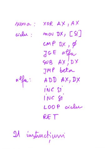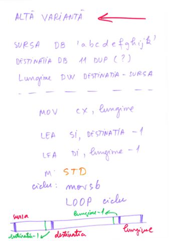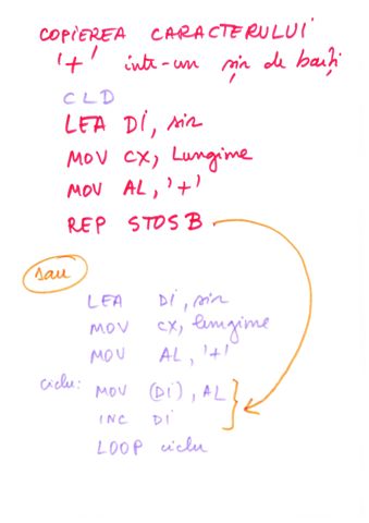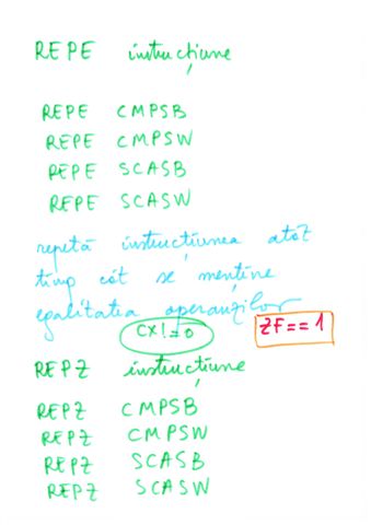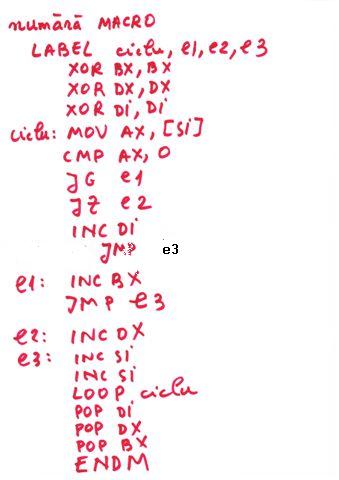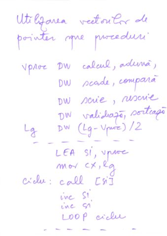 | Instructiune repetitiva conditionata posterior | relizata cu o instructiune etichetata, o secventa de repetat, o instructiune CMP si un salt conditionat inapoi spre instructiunea etichetata | do {...}while() |