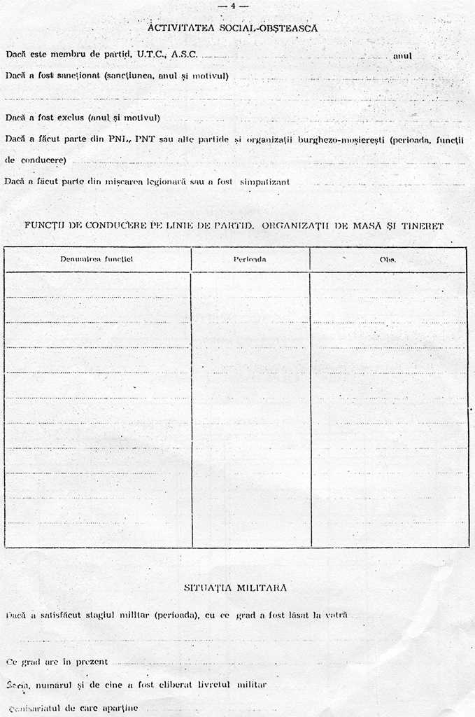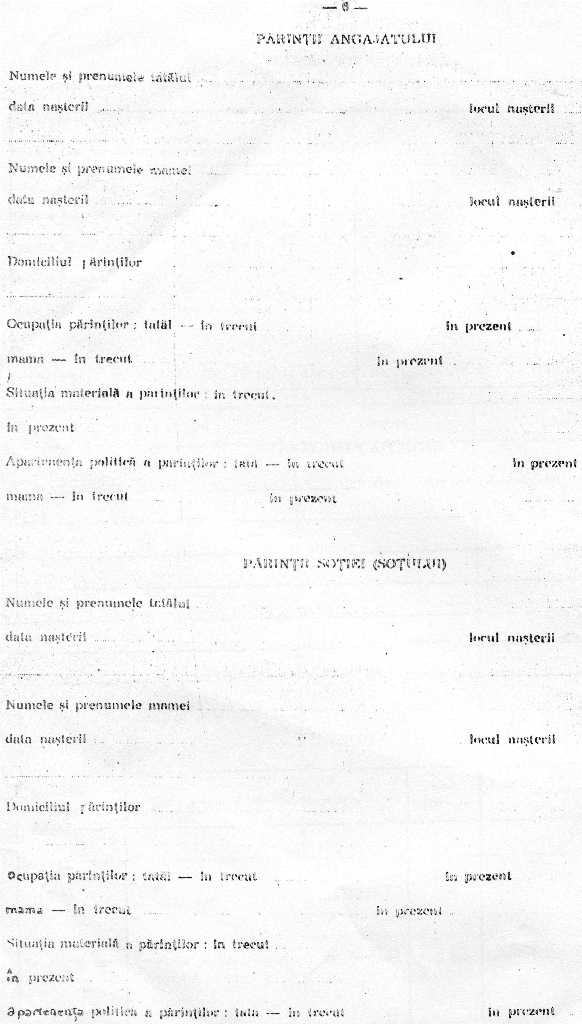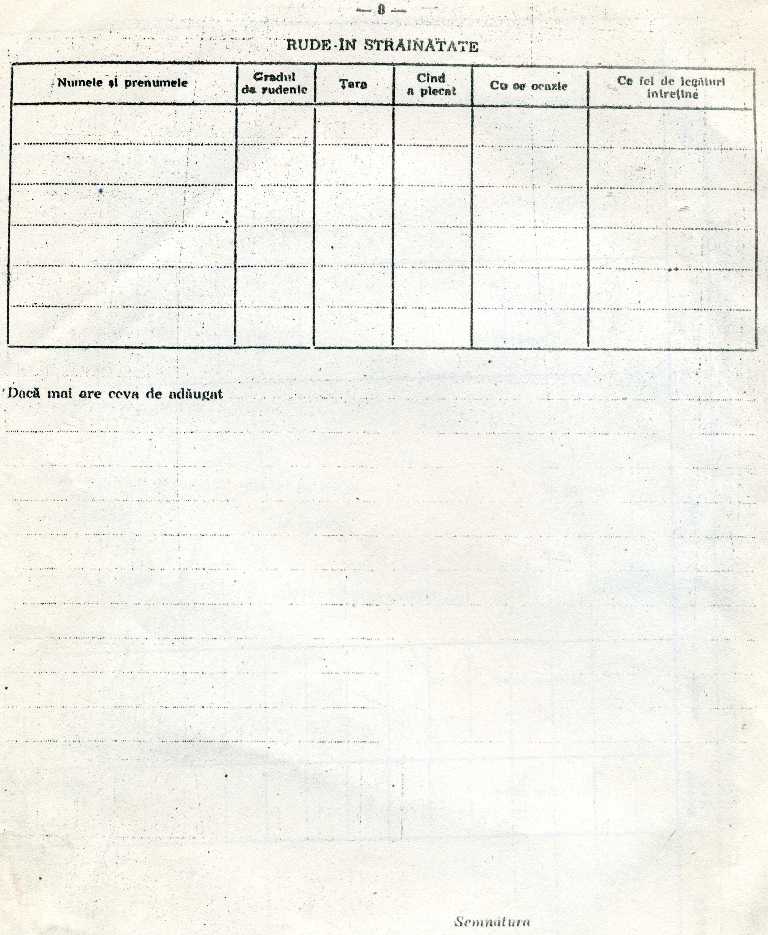 Pagina a 8-a era marea durere, daca aiveai rude in strainatate, pentru ca trebuiau date suficiente detalii. Oricum, numai daca era acolo un rand scris, clar ca cel ce avea o astfel de fisa, nu mai avea cum sa solicite o promovare pe o functie de conducere, director sau mai mult. Erau situatii in care pentru a nu fi puse in situatii dezastruase, cel ce intocmea fisa, nu declara nimic, chiar daca avea rude in strainatate. Numai ca daca se mergea pe fir si se cautau referinte si se afla, nu numai ca respectivul avea de suferit, dar era tratat si ca mincinos, caci a omote era egal cu a minti, a insela. Rspunsul la rubrica ocaziei cu care a plecat ruda, se scria prin casatorie - ceva mai rar, cu ocazia unei excursii - ceva mai des dar niciodata nu se utiliza verbul a fugi desi cand se vorbea despre cineva care ramanea mai ales intr-o tara occidentata, asa se zicea: a fugit in si se insira tara sau tarile unde se banuia ca a ramas ruda. Am cunoscut nenumarate persoane care au avut de suferit ca o ruda mai apropiata sau mai departata le-a plecat. Cand cumnatul meu a plecat/ramas/fugit in occident m-am prezentat sa anunt. Domnul acela s-a uitat la mine si mi-a zis: Domnule, te vad om serios, acum ce vrei? Sa te iau in brate si sa plang ca ti-a fugit cumnatul? Du-te si vezi-ti de treburile dumitale, ca acum am multa treaba. In alte locuri era altfel. de la oameni porneste totul. Nu aveam functie de conducere, pozitia mea nu era ravnita de nimeni.