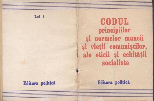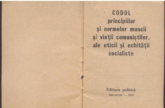 Editura Politica a publicat in anul 1981 CODUL PRINCIPIILOR SI NORMELOR MUNCII SI VIETII COMUNISTILOR, ALE ETICII SI ECHITATII SOCIALISTE