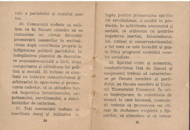 care contineau elementele calauzitoare pentru fiecare zi de munca si de viata a tuturor membrilor societatii si priveau: - apararea tarii - rezolvarea sarcinilor de serviciu - solutionarea sarcinilor de partid - apararea proprietatii socialiste - sa nu fure - sa gospodareasca apa, padurile, mediul - sa aprecieze munca - sa se instruiasca mereu - sa apere integritatea tarii - sa fie vigilenti - sa cultive prietenia cu toti cetatenii - sa respecte legile tarii - sa promoveze principiile eticii si echitatii - sa respecte, sa aprecieze - sa nu tolereze minciuna - sa creeze climatul de dezbatere idei - promovarea pe criterii valorice - sa fie curajosi - sa dezvolte spiritul critic, de initiativa, exigent - sa combata violenta - sa promoverze stiinta - sa respecte familia - sa pregateasca tanara generatie pentru munca si viata - sa insufle dragostea de tara - sa combata rasismul, sa respecte demnitatea nationala. Acum partidele au definite in statute niste rudimente de cerinte de comportament. Drept care facultative fiind, dintre cei care zabovesc in puscarii sunt ilustri membri de partid. N-au respectat legea, pentru ca in firea lor era sa faca faradelegi. Iar statutul partidului lor era o amintire, adeziunea fiind certificatul pentru o functie bine remunerata si pentru accesul la borcanul cu miere, borcan in care a bagat degetul apoi mana, apoi intreg bratul, pana cand a membrul de partid s-a pravalit in borcan cu totul. |