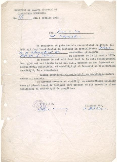 Admiterea la doctorat a devenit un obiectiv atunci cand am vazut ca toti colegii din catedra mai mari ca mine erau doctoranzi si se faleau cu aceasta calitate ori de cate ori era nevoie, sa se dea mareti, destepti, sublimi si etc. Trebuia sa am un conducator. Adica sa-mi aleg un conducator. Eu am avut intotdeauna fixatia ca eu aleg si nu sunt orientat si cu atat mai putin sa ma aleaga pe mine cineva. Asa ca m-am gandit cu cine cred ca ma voi intelege dintre profesorii cu drept de conducere de doctorat dintre cei cu care am lucrat la cursuri in anii de studii. Mi-am facut o lista in gand, stiam de fapt cu cine as dori sa lucrez, dar pentru linistea mea am facut acea lista. I-am exclus rand pe rand si am ajuns de unde am plecat, adica la profesorul universitar doctor Ludovic TOVISSI.